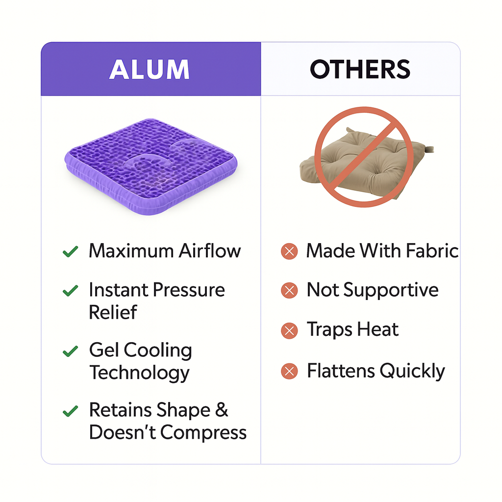 Our cushion uses an engineered gel grid that adapts to your body and redistributes pressure evenly. This reduces strain on the spine, hips, and tailbone while maintaining airflow to keep you cool. The removable, washable cover keeps it clean, secure, and performing at its best.